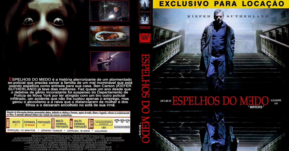 Espelhos do Medo. Kiefer Sutherland (da série 24 Horas) fica frente a frente com uma das mais malignas forças do mal neste chocante suspense do diretor de Viagem Maldita. Durante um sincero esforço para colocar sua vida nos eixos, um ex-policial (Sutherland) arruma um emprego de segurança das ruínas incendiadas da anteriormente famosa loja.