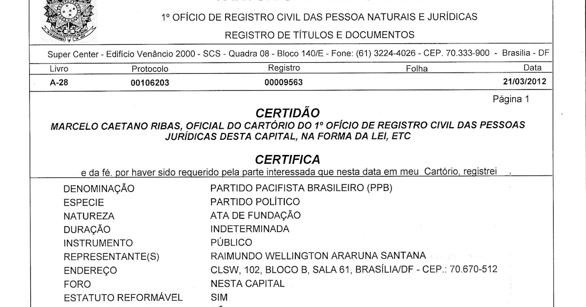 Partido Pacifista Brasileiro Certidão Inteiro Teor e D.O.U. Dados