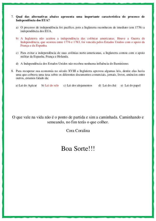 Independência dos Estados Unidos e Revolução Francesa. 2) Leis britânicas acirraram as divergências entre colonos americanos e a Coroa inglesa, provocando a luta pela independência. Dentre os objetivos dessas leis, destacam-se: a) aumentar a receita real, impedir o contrabando e o comércio intercolonial e recuperar a Companhia das.