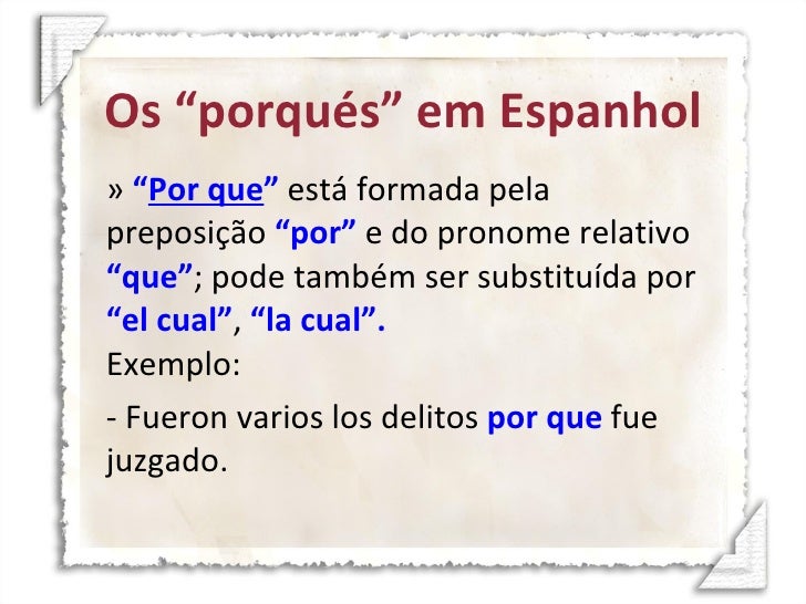 Por que. Assim como acontece na utilização do por qué em perguntas, o uso do por que também resulta da junção de uma preposição ("por") com um pronome relativo ("que"). Na língua espanhola, essa palavra também serve para indicar motivo, causa, podendo ser usado no lugar de termos como "por el cual" - pelo qual - e.